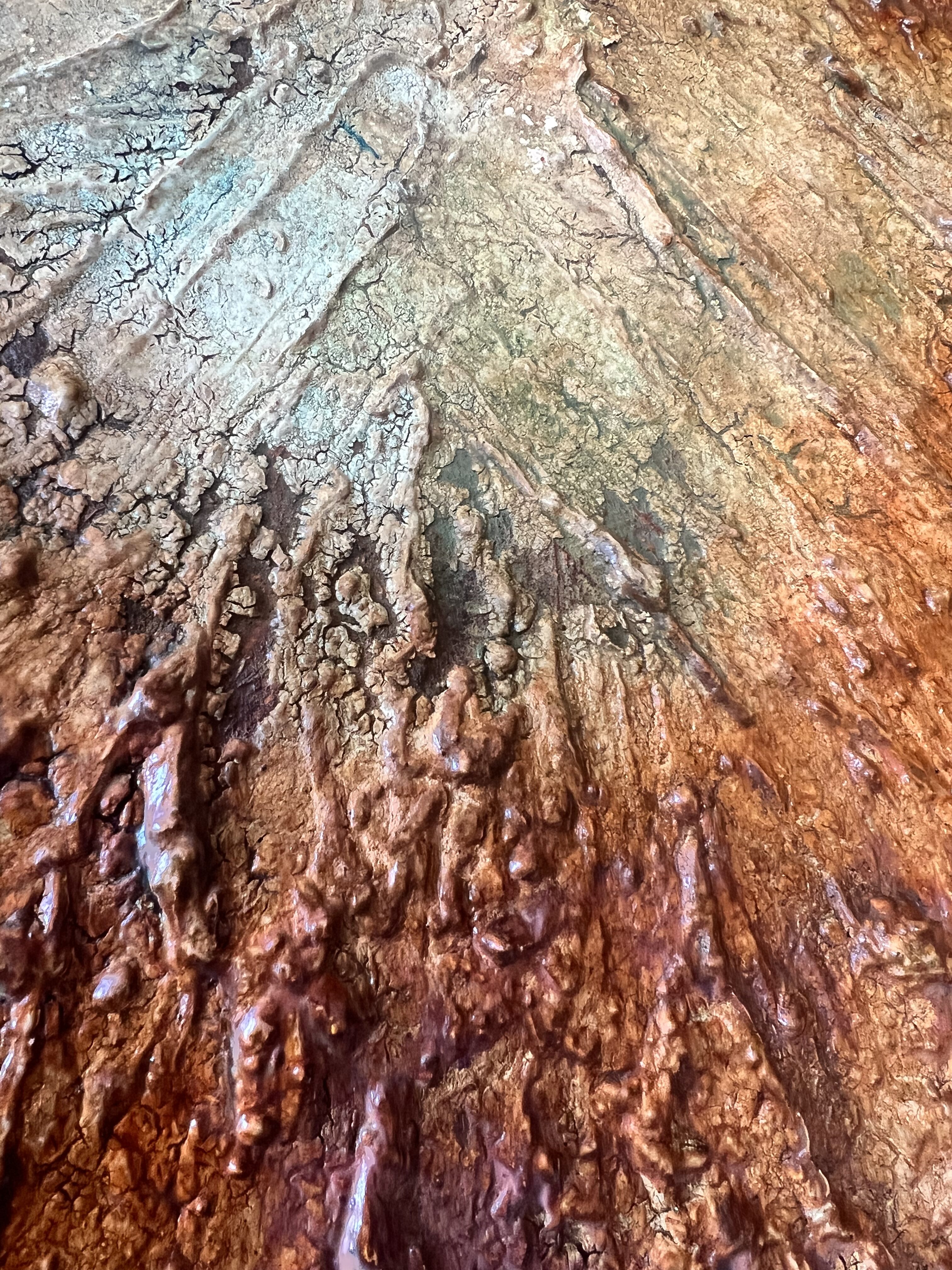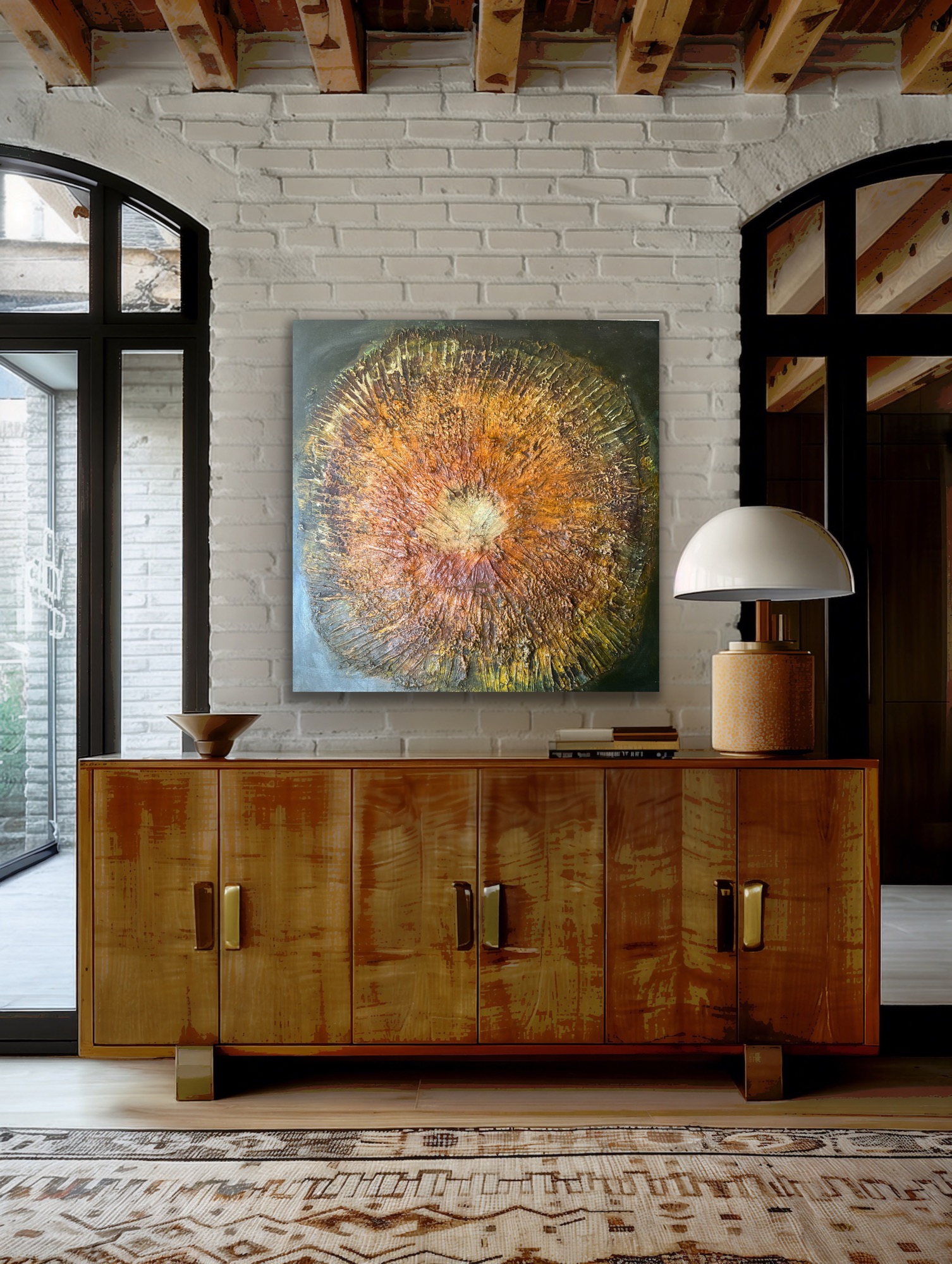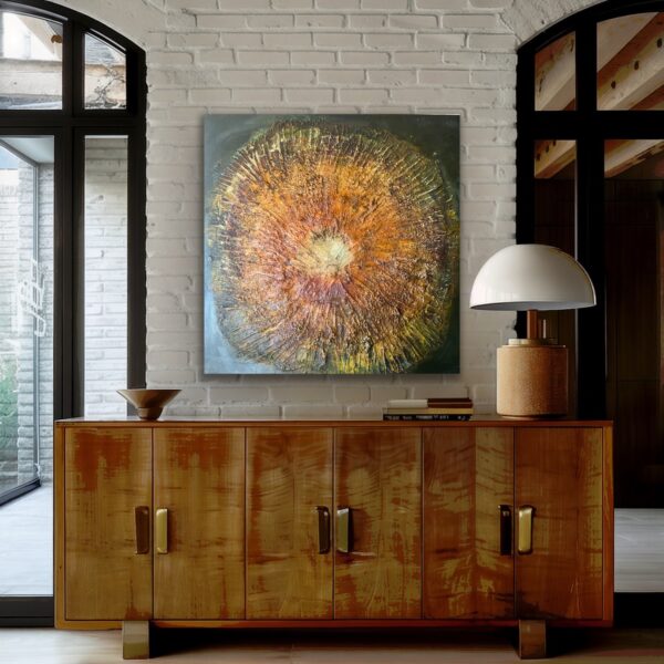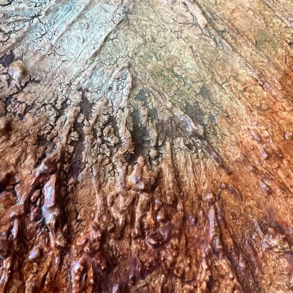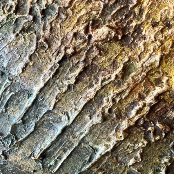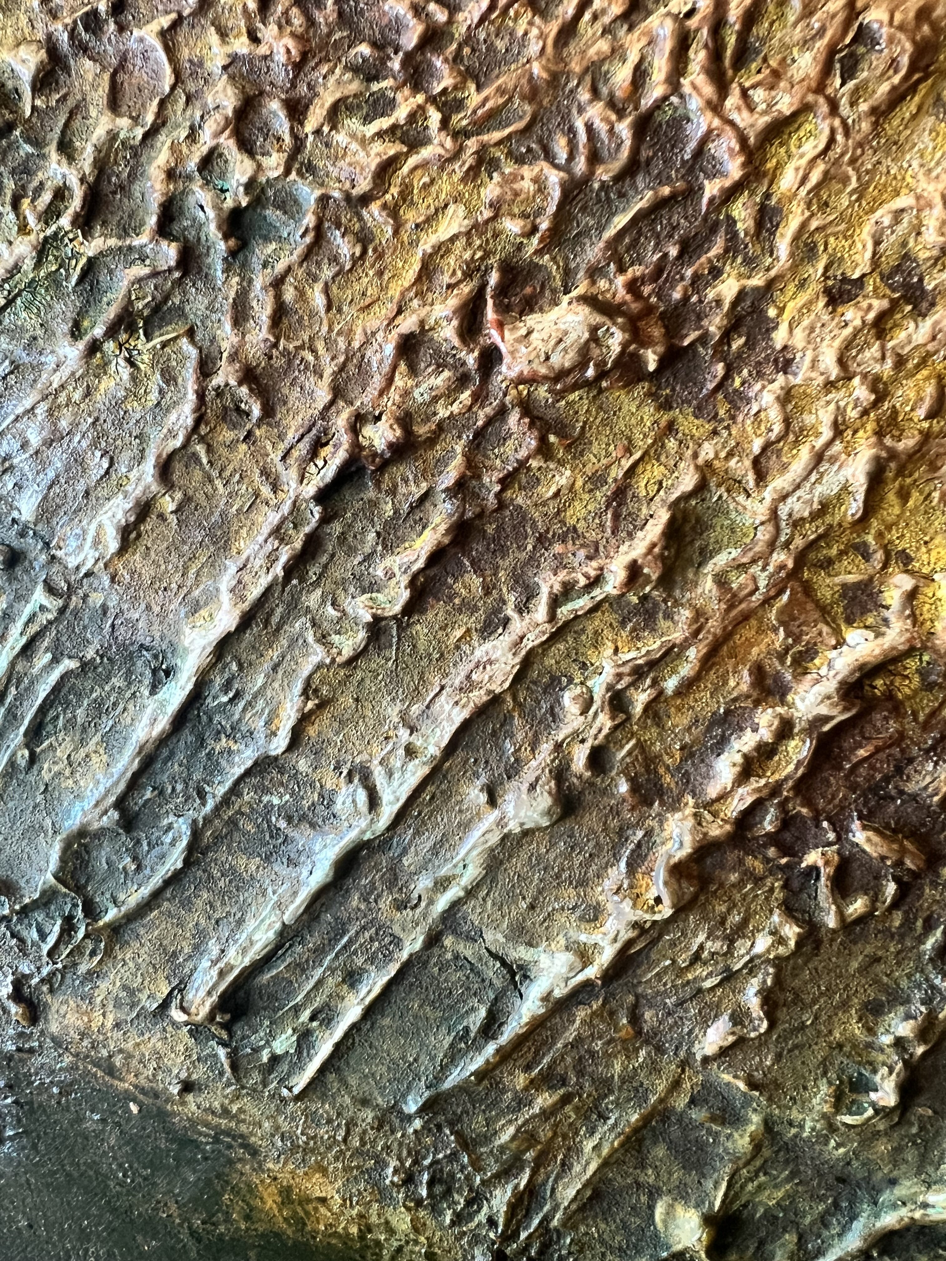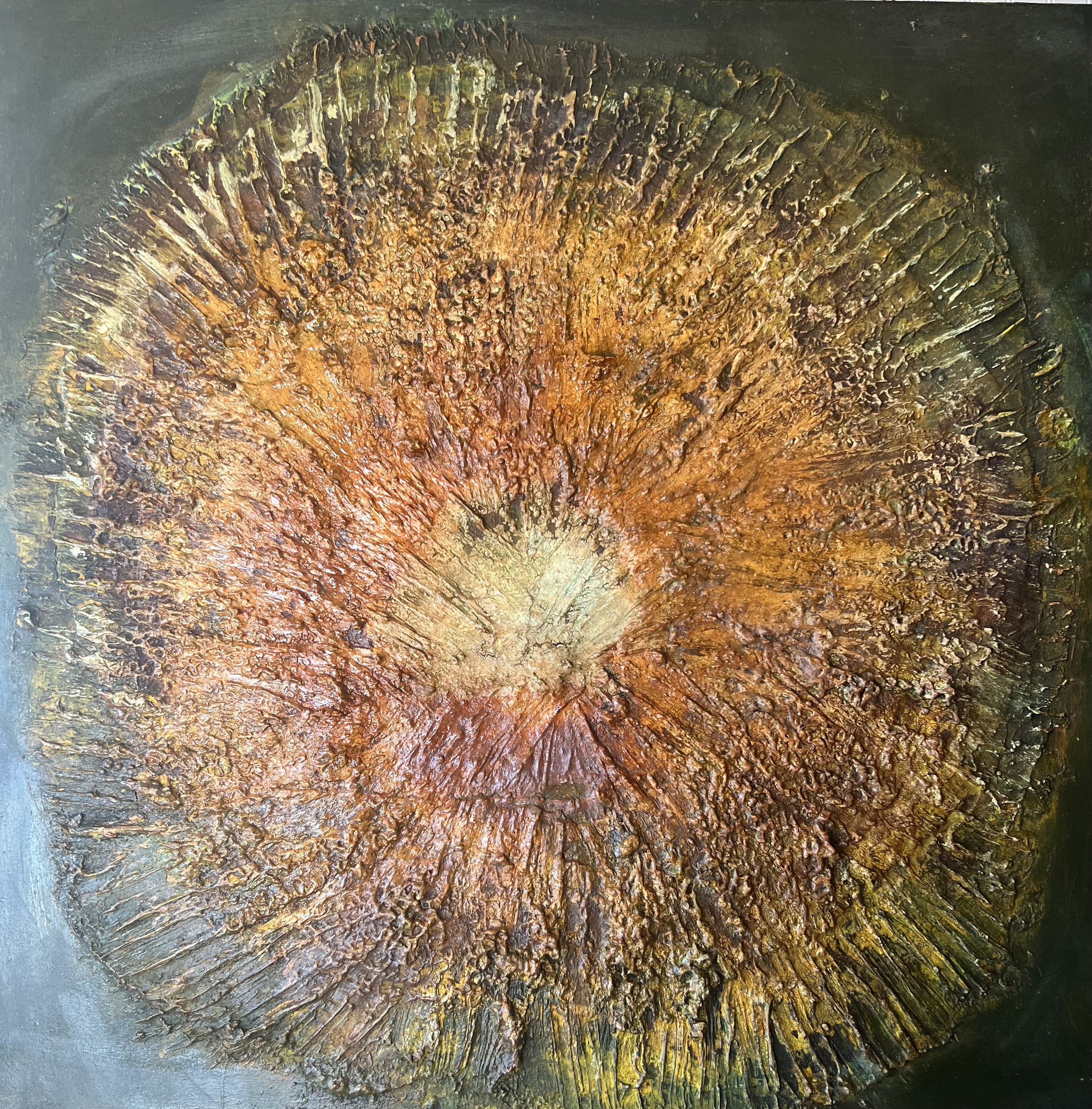Nature is most beautiful as things are about to leave. The long shadow of autumn reveals that the colors of the prairie are at their brightest just before they fade. The circular form at the heart of the painting presents the cycle of life and death, growth and decay. I made radiating lines to evoke the veins of wild plants, now beginning to fold inward. The texture speaks to the roughness of change and the way that time wears on beauty, but does not diminish its grace. Made with grain, stone, rust, plant ash, and paint.
